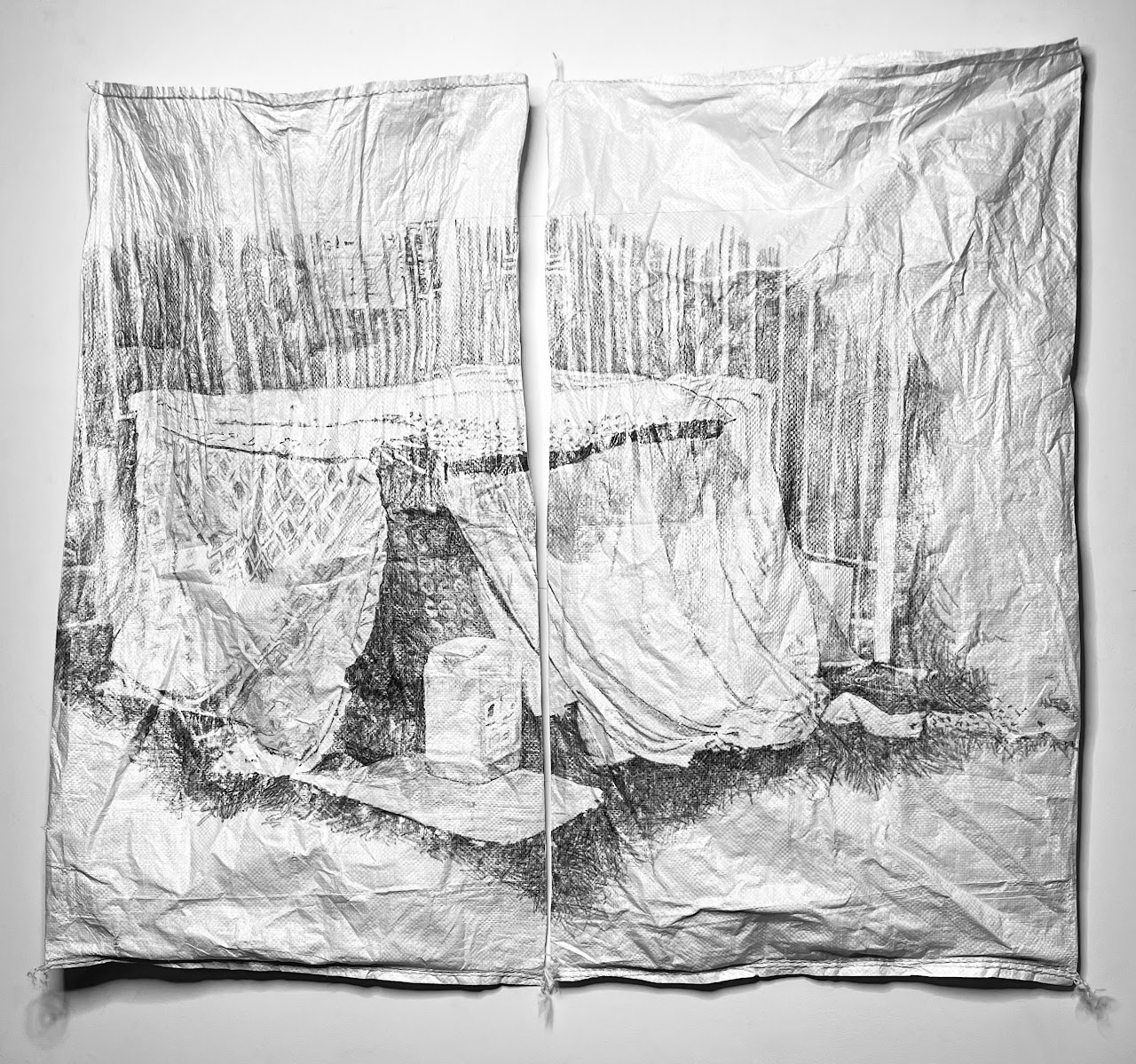 Avec cette exposition de dessins au crayon sur papier et sacs à gravats, elle interroge l’ancrage de l’éphémère qui s’accommode des restes et dénonce l’infiltration de la précarité dans nos sociétés ainsi que la violence du nettoyage urbain pour questionner notre humanité, notre hospitalité.